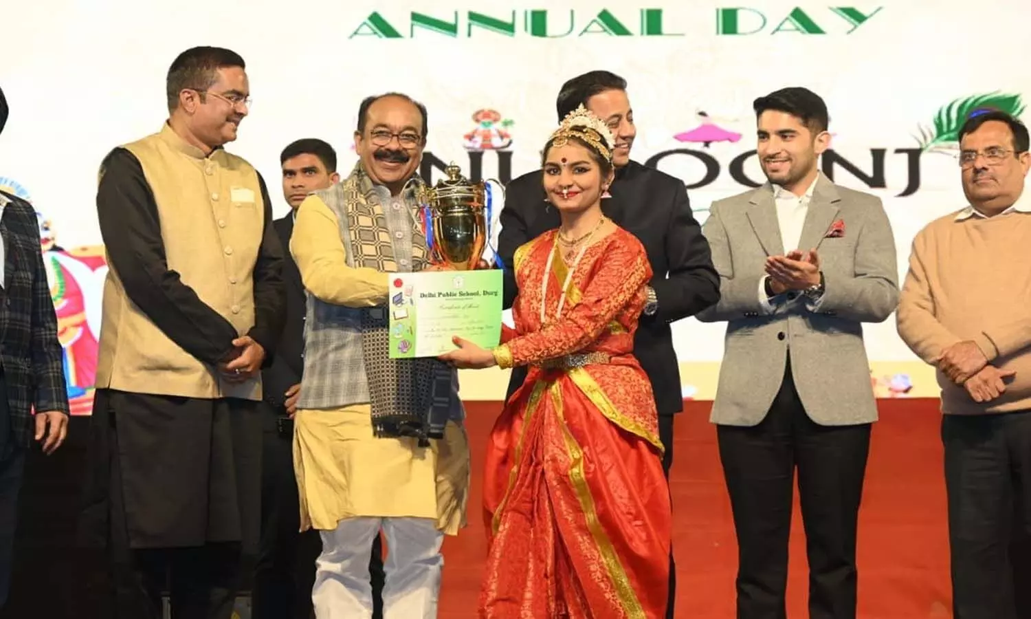 डीपीएस दुर्ग के वार्षिकोत्सव समारोह में छात्रा को पुरस्कृत करते हुए चीफ गेस्ट डिप्टी सीएम अरुण साव